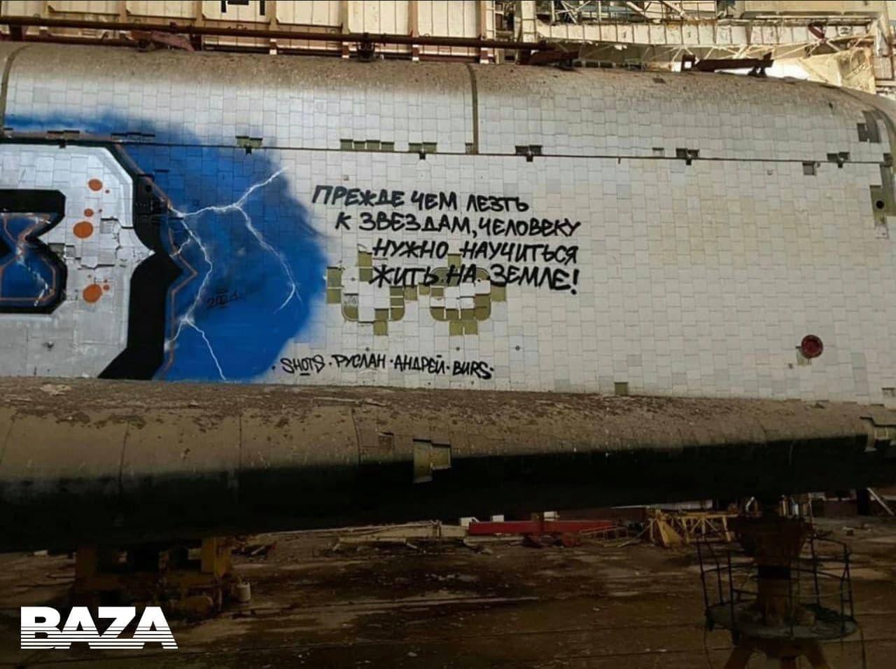 Неизвестные художники проникли в монтажно-заправочный комплекс космодрома и оставили послания на летном корабле.