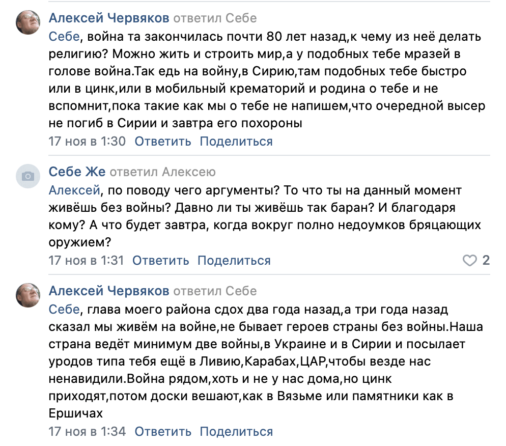 Сотрудники ФСБ задержали жителя города Сафоново Смоленской области Алексея Червякова из-за комментариев к посту о граффити с ветераном в сообществе «Подслушано Смоленск» во «ВКонтакте». Червяков также создал группу «Сафоновские ведомости» и участвует в жизни других местных пабликов. В записи сообщалось, что на фасаде смоленской школы №22 нарисуют граффити с изображением ветерана Виктора Якунина. Алексей Червяков задался вопросом, что даст школе такой портрет, назвав участника Великой Отечественной войны «хероем» и «вытираном» (переделанные слова «герой» и «ветеран»). Также он раскритиковал правительство России из-за «культа войны» в стране. 23 декабря к Червякову пришли с обыском, после которого его задержали и увезли в Смоленск. Против мужчины возбудили уголовное дело о публичном оскорблении памяти защитников Отечества и унижении чести и достоинства ветерана ВОВ. Максимальное наказание по этой статье — пять лет лишения свободы. 3