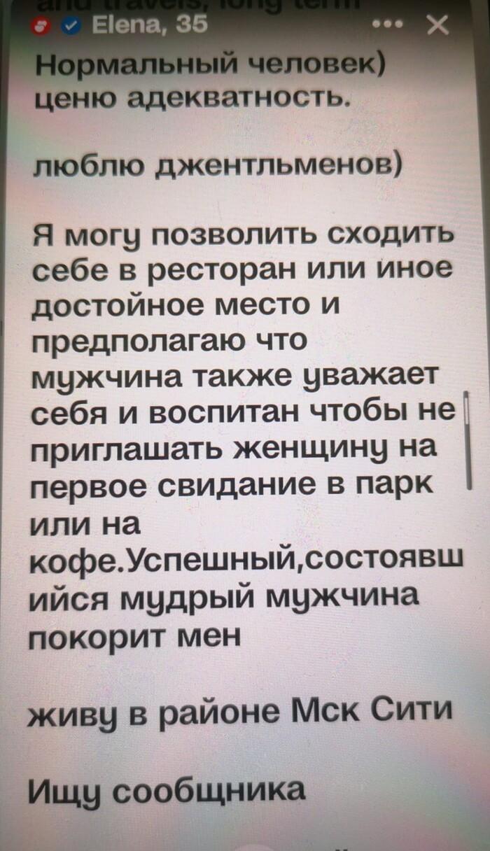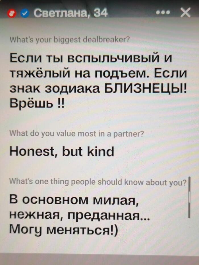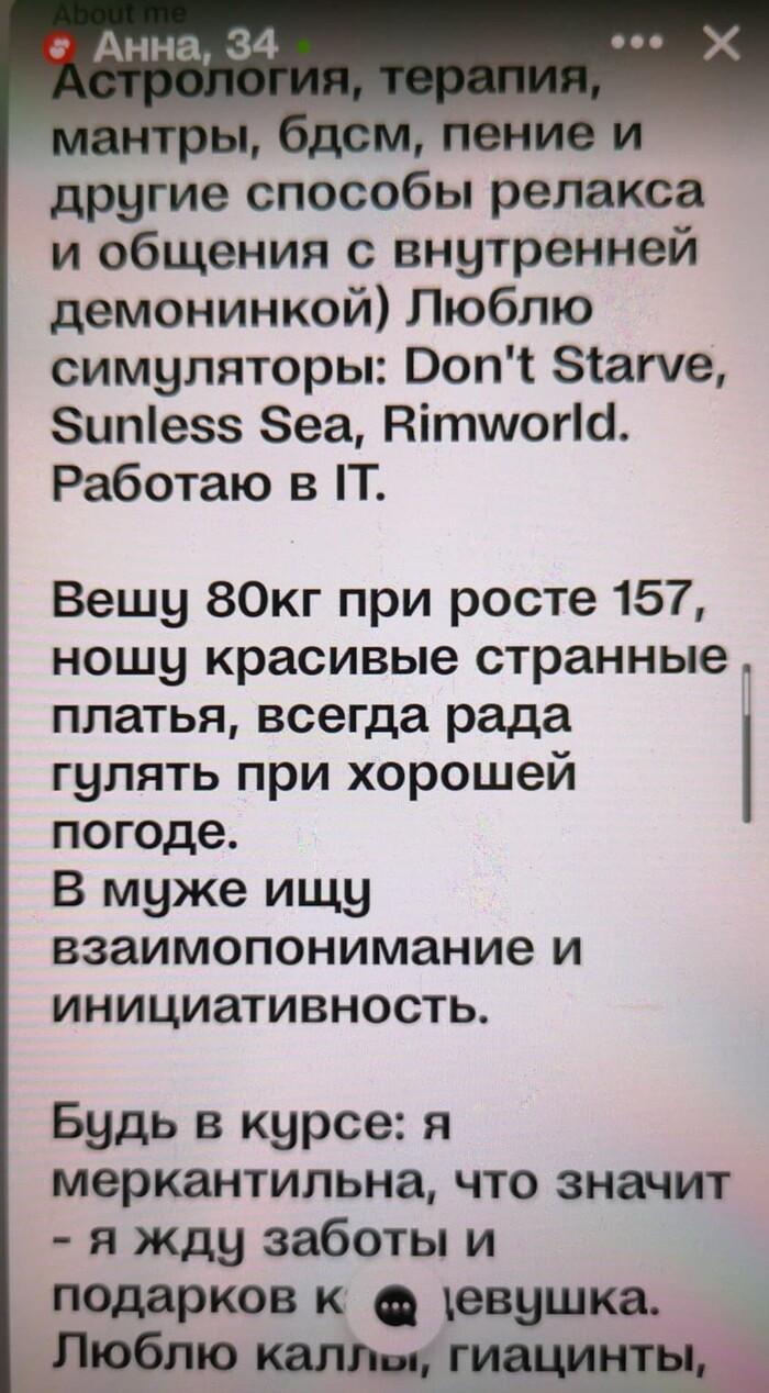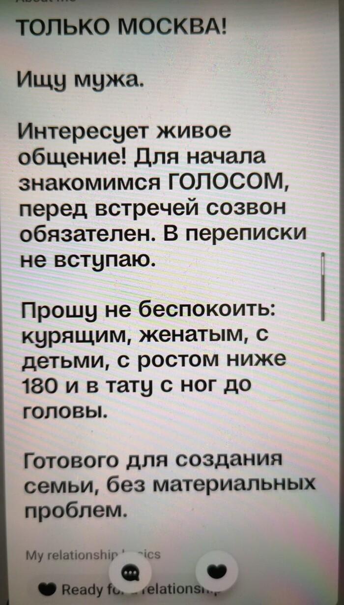 Я проделал долгий путь, и общался со всеми типами, представленными ниже. Потом возвращался, проводил рандомизированные, контролируемые исследования, делал выборки, скрининги, и выкладываю тут только перепроверенную информацию. 1) Начнем с нового типа женщин. Появились они только лишь последние пару лет как. До этого не наблюдались. Я их называю – «шлюшки в отставке». Их появление вызвано массовой миграцией представителей среднего класса и мелкого бизнеса за рубеж. В обывательском представлении многих бизнесменов "за рубеж", роскошь и шик – это Дубай. Туда зачастили многие. По привычке, они тащили туда своих любовниц и самых различных женщин с низкой социальной ответственностью. Такие женщины хороши для любви, краткосрочной, на пару минут. Еще они умеют фотки красивые в инсте делать. Также много едят и шопятся. В целом их содержание на постоянке в другой стране не очень выгодно. К тому же, там сейчас высокая конкуренция представителей других славянских стран. И их выкидывают на мороз в пустыню. Кто-то пытается искать различных восточных принцев, которых всегда не хватает. Работать такие женщины не приспособлены, они созданы для любви. Любовь денег приносит только пару лет, пока сиськи не износятся, а кушать хочется всегда. И мы видим далее абсурдную ситуацию Баба создаёт анкету. Пишет текущую локацию, где она её создала, ибо изначально ёбыря хочет найти там же, в Дубаях. (мне пох, я всё буду склонять). Когда ебырь не находится, баба возвращается назад, в Москву. И мы имеем дохуя анкет, где показано, что куча баб из дубаев сейчас в Москве. Локацию поменять – это ж догадаться надо. Особо хорошо эти опытные женщины видны в бумбле – там пишет и изначальное место проживания и регистрации анкеты, и текущую позицию. Я бы про них не писал, если бы это были единичные случаи. Но их реально на СЗ тысячи однотипных. Все живут в Дубаях. И все почему то на данный момент находятся в Москве. Поебать – можно. Просто скажите, что вы бизнесмен, и улетаете на следующей неделе в Дубай. И ищете спутницу. Ближайшие пару дней вам гарантированы превосходные плотские утехи. (В Дубай можно потом не везти, если чё) Но, лично мне не подходит. У меня цель найти единственную, неповторимую (ок, максимум двух), наделать с ней детей и жить счастливо. Профессиональные жрицы любви, как бы они себя не называли, на эту роль мне не подойдут. Может моя теория и ошибочна, но я не могу по-другому объяснить, откуда столько русскоговорящих женщин сейчас, которые пишут, что постоянно живут в Дубаях, находясь при этом в Москве. 2) Американ-бой, уеду с тобой. Параллельная ветвь развития с первым типом. Мечтают о знакомстве исключительно с иностранцем. При этом может даже не выезжать в жизни из своей Рязани, но анкета при этом будет заполнена на английском языке. Задайтесь вопросом – а нахуя? Первое нахуя – зачем она так заполняет? Если находится в России, и родной язык русский? Второе нахуя – а нахуя оно вам лично надо? Девушка сразу обозначила приоритет, что перепрыгнет с вашей ветки на ветку любо проходящего мимо индуса, минимально владеющего англицким, только потому что «он иностранец». Хотя…по аналогии с первым вариантом, можно также это использовать в своих интересах. Сделайте себе анкету норвежца Сигизмунда, и ебите их на здоровье. Норвежского они всё равно не знают, как и вы. Но, хотя бы лом