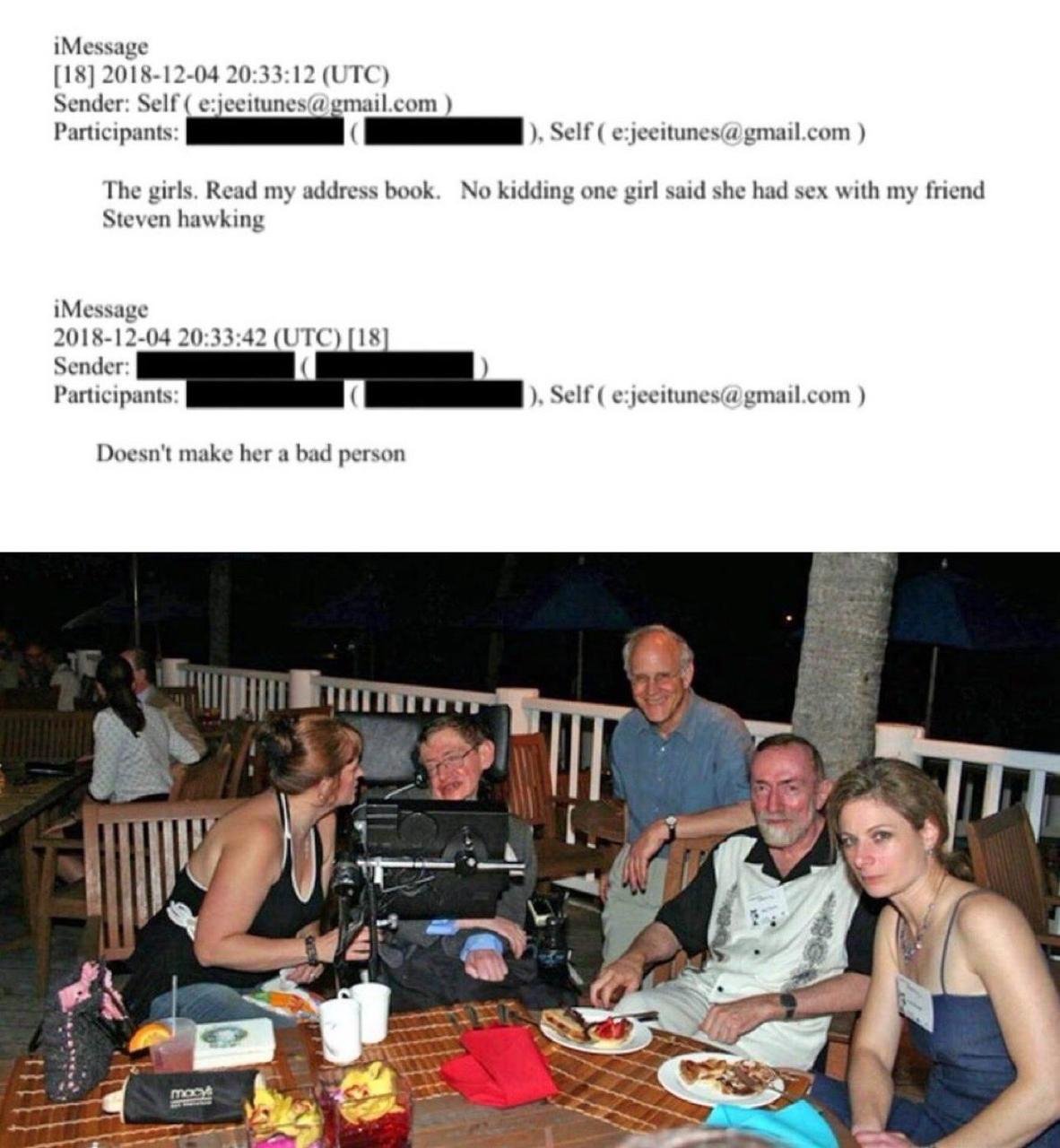 Стивен Хокинг занимался сексом с моделями на острове Эпштейна, заявляется в файлах, обнародованных Минюстом США Имя легендарного ученого упоминается более 230 раз в файлах, несколько раз в контексте секса: Я не шучу, девушка сказала, что у нее был секс с моим другом Стивеном Хокингом Также в сети вспомнили фотки Хокинга в окружении женщин на острове Эпштейна 0