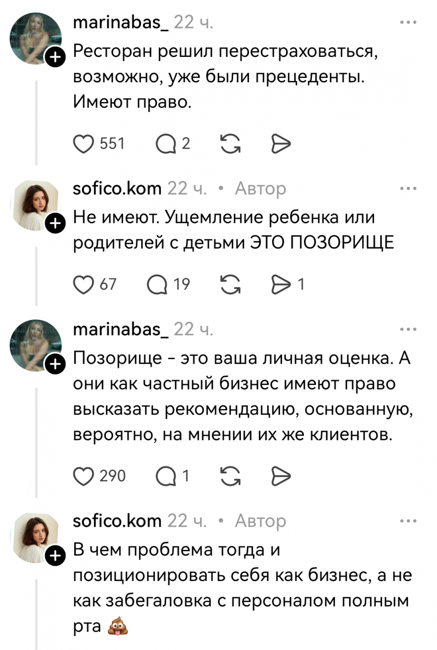 для родителей с детьми есть другие заведения, где дети никому не доставят неудобство своим присутствием. сам подумай. сидишь такой в рестике, отдыхаешь с пацанами, громко разговариваешь и тут рядом столик занимает мамаша с младенцем. все. люди сразу тише начинают разговаривать, или совсем не могут разговаривать, если малой начал капризничать и орать. кароч, у людей появляется ограничение, это портит атмосферу больше, чем подгоревший стейк. а заведению нахрена это, им важнее гости, а не одна гостья с коляской, т.ч. справедливо послали нахуй, причем вежливо.