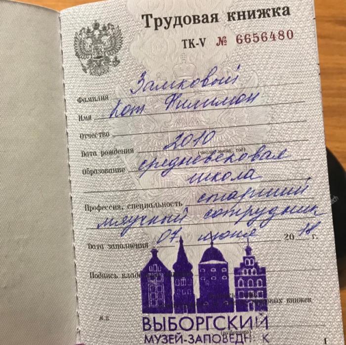 Трудовую книжку с должностью старшего мяучного сотрудника получил кот музея–заповедника «Выборгский замок» ФилимонТрудовую книжку с должностью старшего мяучного сотрудника получил кот музея–заповедника «Выборгский замок» Филимон22 Июня 2018