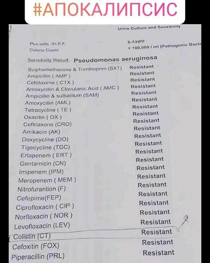 Вы думаете что апокалипсис начнется с яркого, послегрозового вкуса высоких радиационных полей? Металлического привкуса стронция и циркония? Сладковатого привкуса плутония? Неа. Все будет не так. Апокалипсис будет выглядеть сухо, и строго. Вот так. К примеру. Что это бумажка показывает не знаете? Нет? Ну я вкратце - это тест посева на антибиотики. Причем не чего либо - а синегнойной палочки, которая шутить не любит и действует КРАЙНЕ быстро. Что мы видим на данном листке? Полную нечуствительность к антибиотикам. Ага. Комментарий к фото от врача, это перевод с английского Очерки врача-комбустиологаОчерки врача-комбустиолога23 Октября 2019